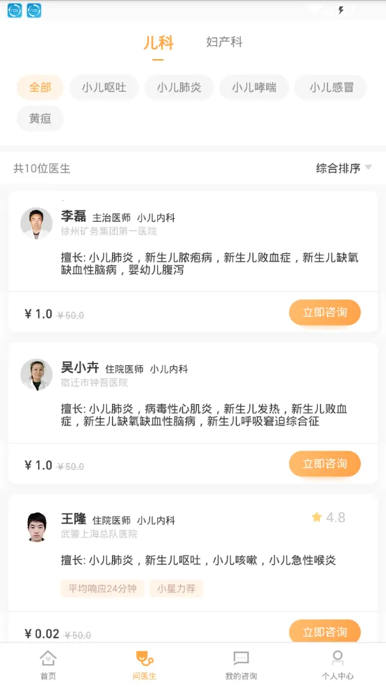 3、切换到儿科或其他科室分类,筛选对应病症医生,了解其擅长领域与咨询价格。