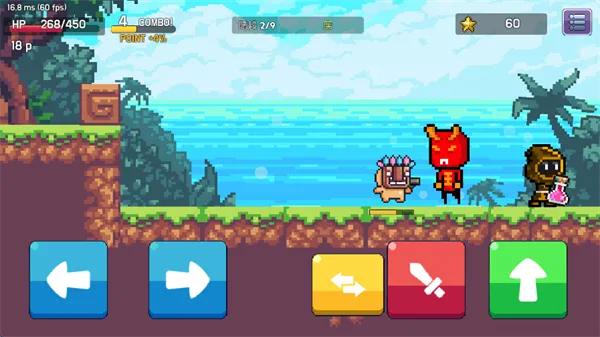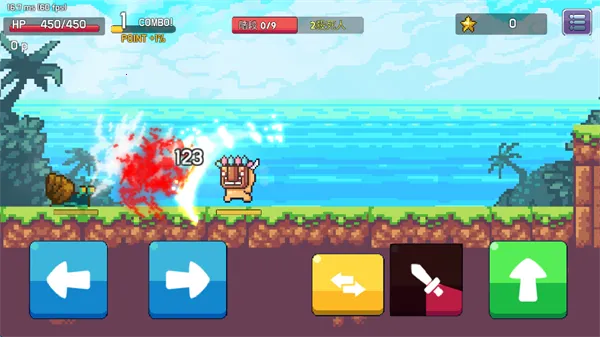 2、屏幕左侧的左右键位可以控制角色的移动方向,屏幕右侧可以控制角色的攻击,跳跃,以及武器的切换,游戏开始之初,角色会有近战和远程两个武器。