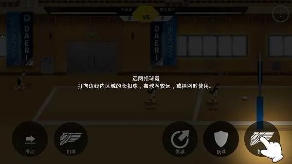 近网扣球键专为网前强攻设计,需把握二传到位时机,配合走位打出难以拦防的斜线或直线重扣。