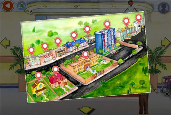 进入游戏后,点击左上角地图图标,即可在房屋、商店、学校、医院等四大主场景间自由切换,每个场景均支持缩放与平移操作,探索毫无阻碍。